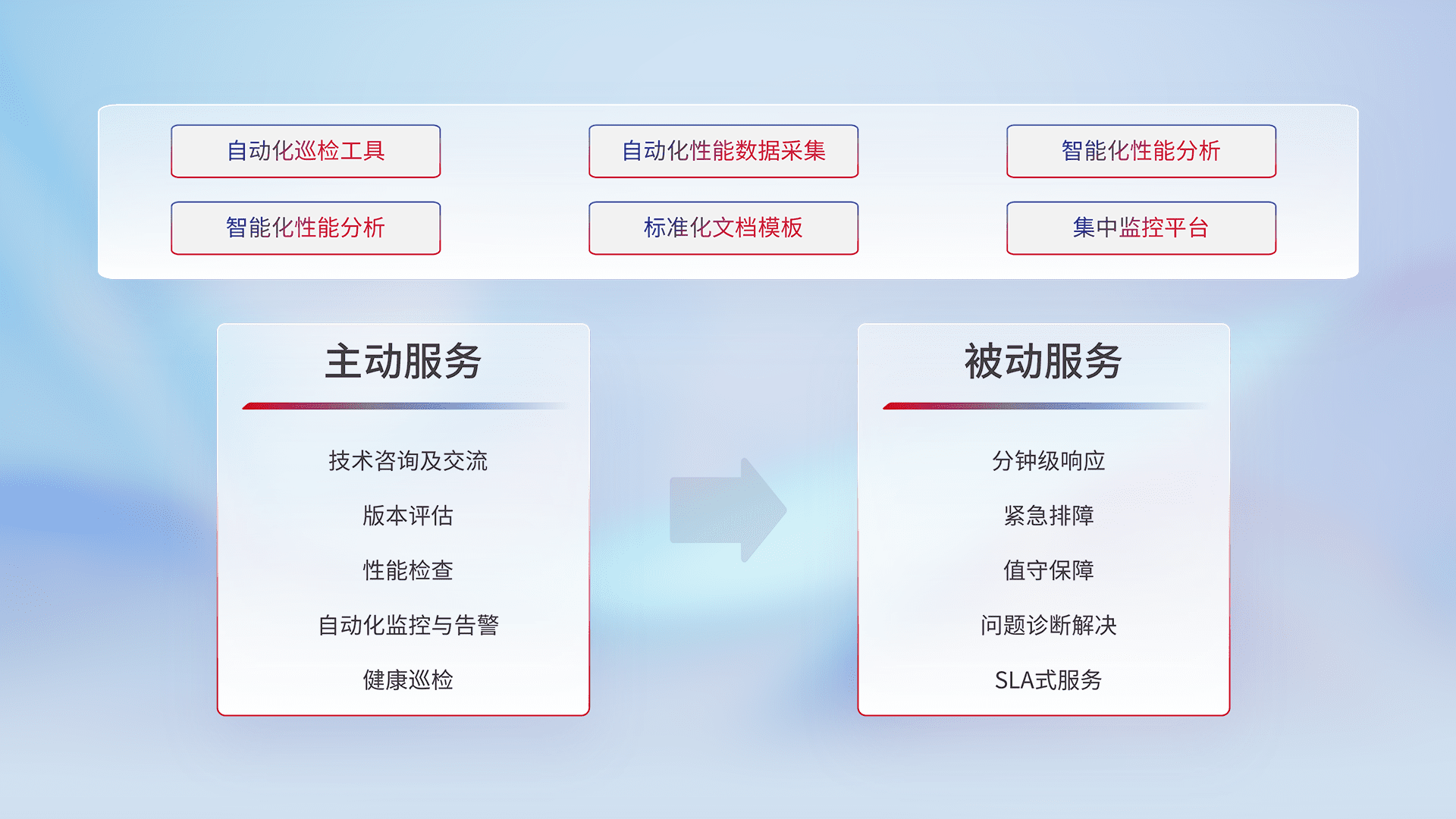 智能化工具和标准化文档,,,保障服务质量,,提供主动服务(包含技术咨询、、版本评估、、、、性能检查、、、自动化监控与告警、、健康巡检)和被动服务包含(分钟级响应、、、、紧急排障、、、值守保障、、、、问题诊断解决、、SLA服务)。。。